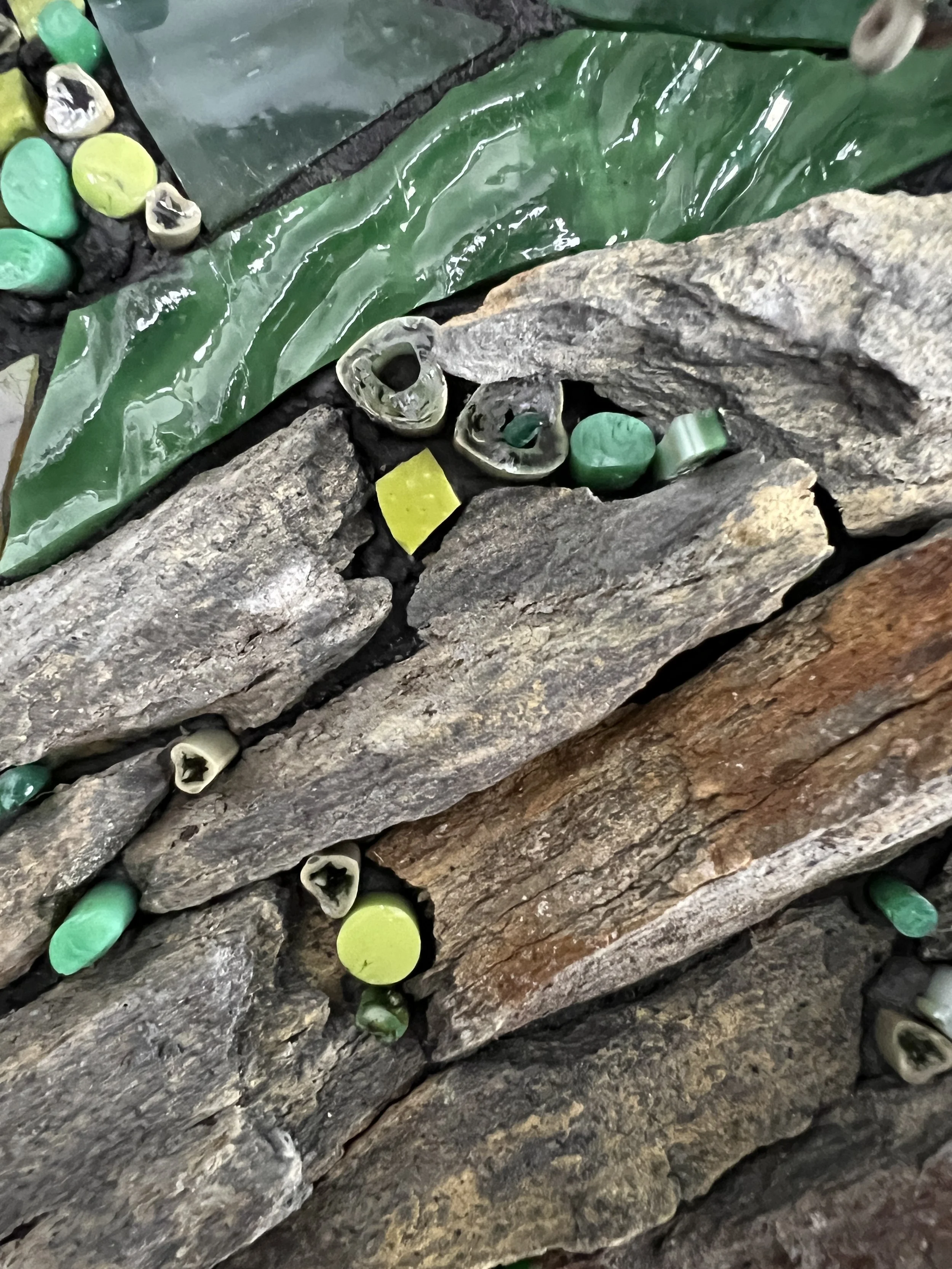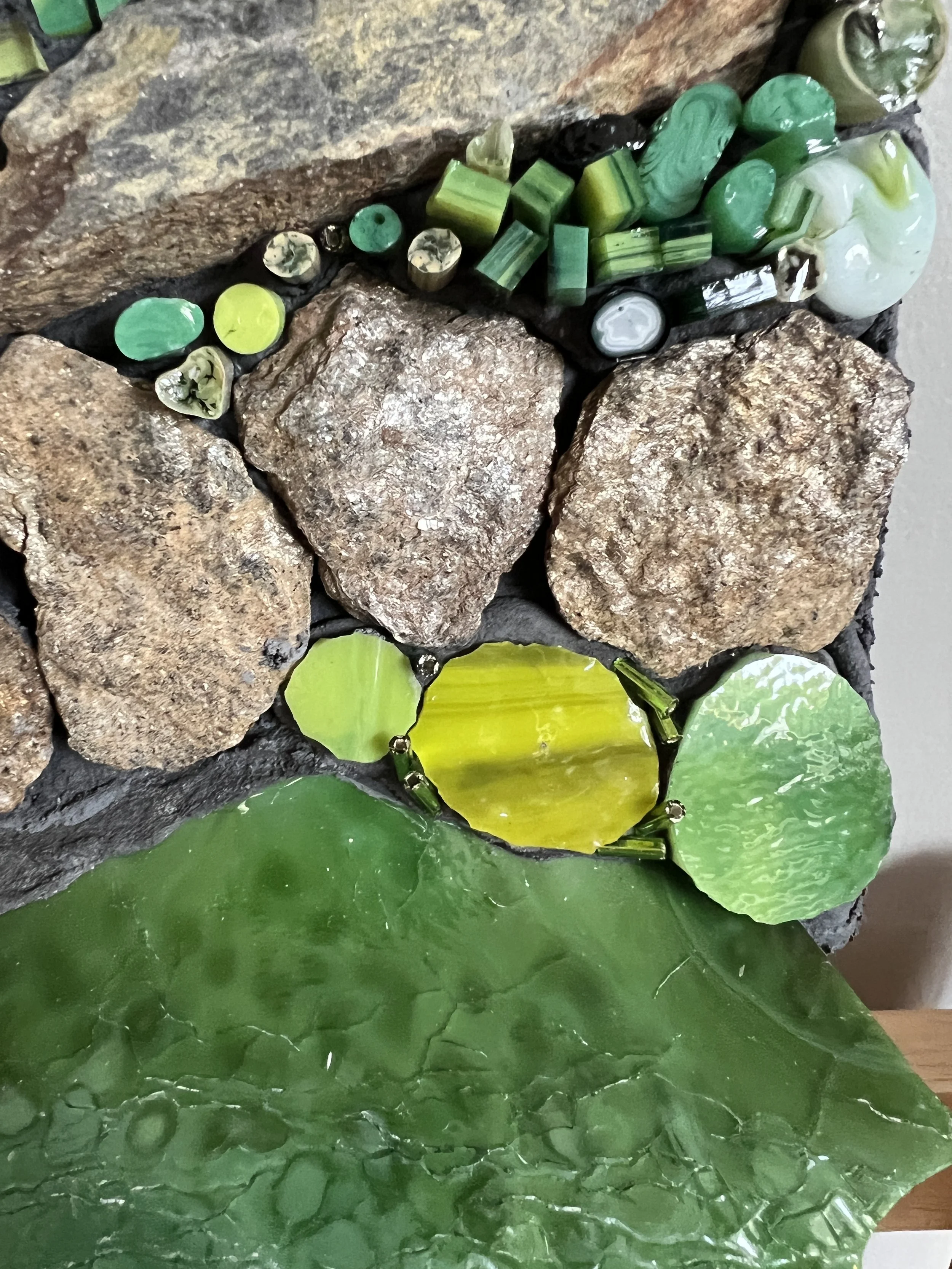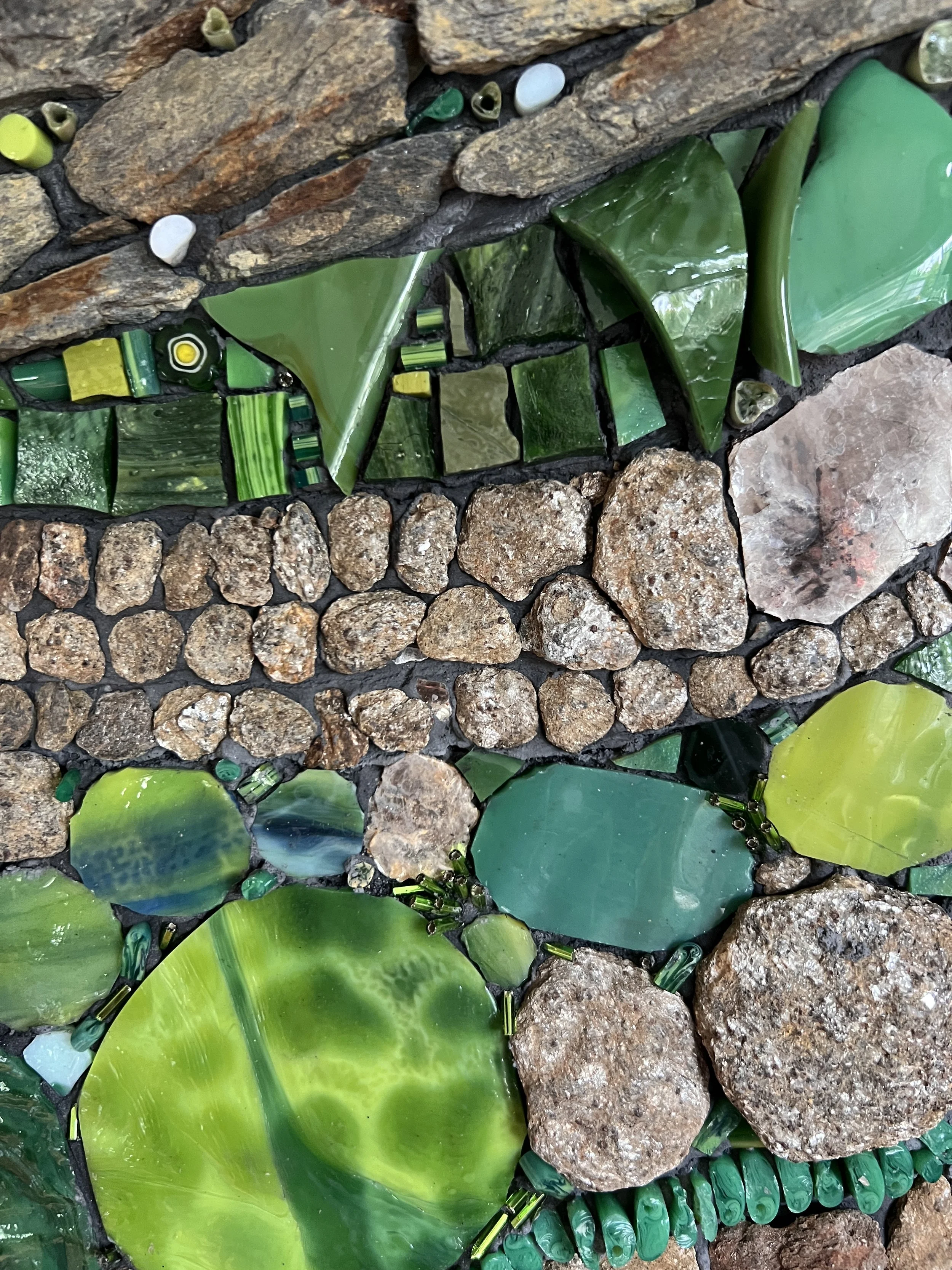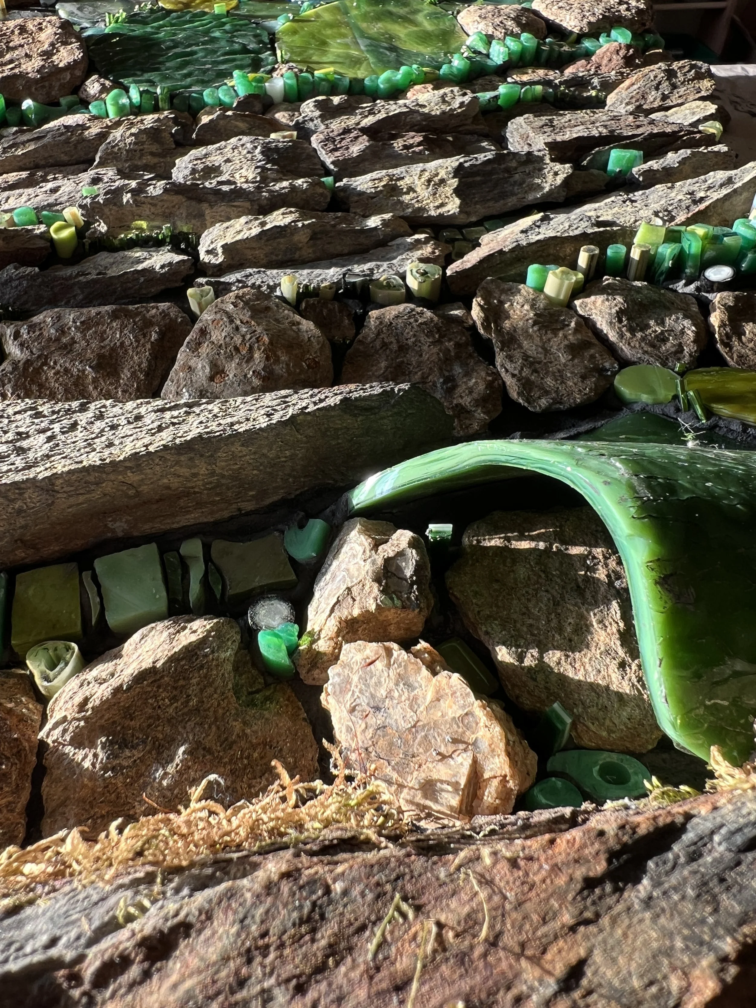 Materials: rocks foraged in Western North Carolina, stained glass, aluminum machine shop shavings, and LOVE. This piece is like a little city. How do we govern ourselves? And each other?