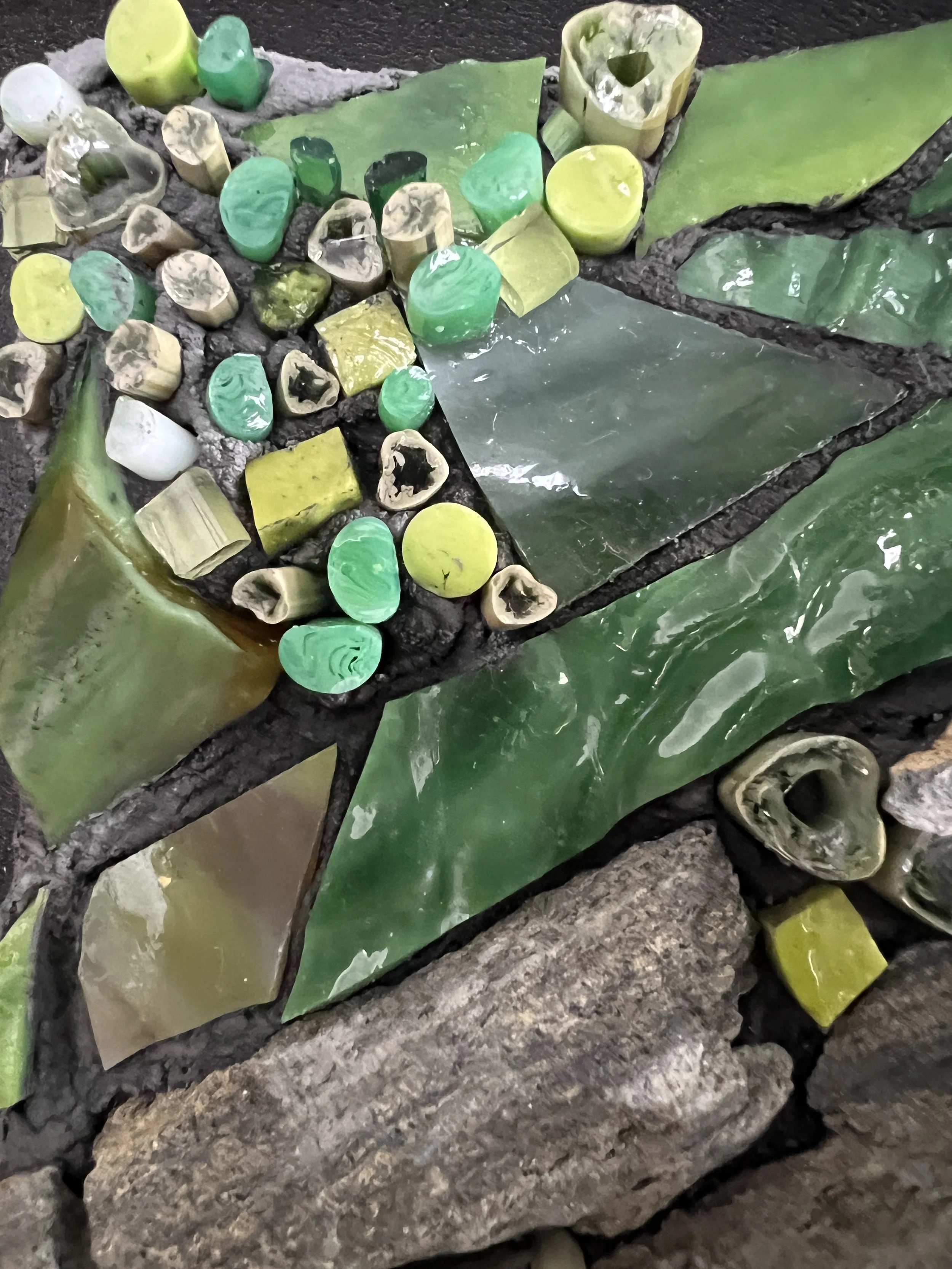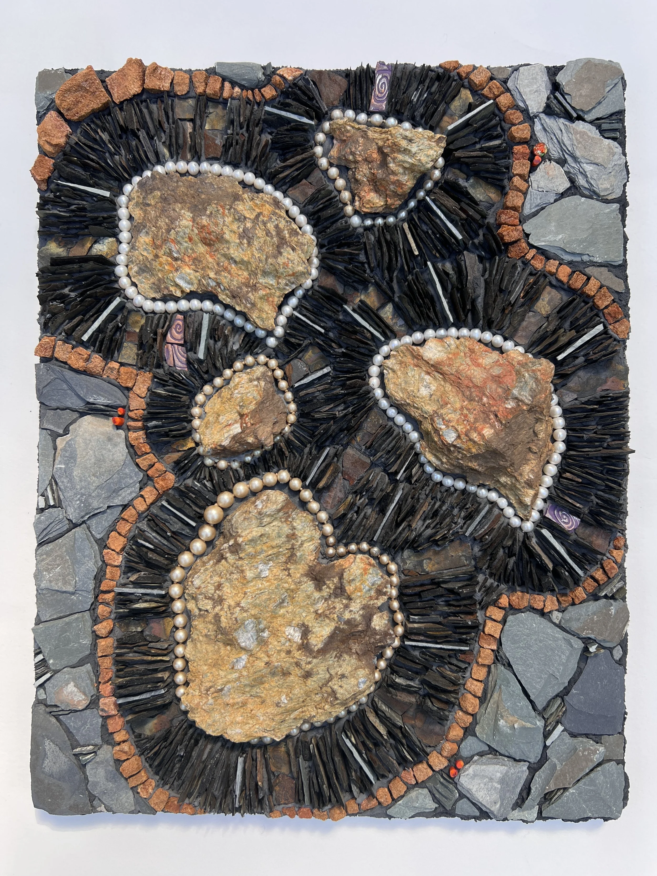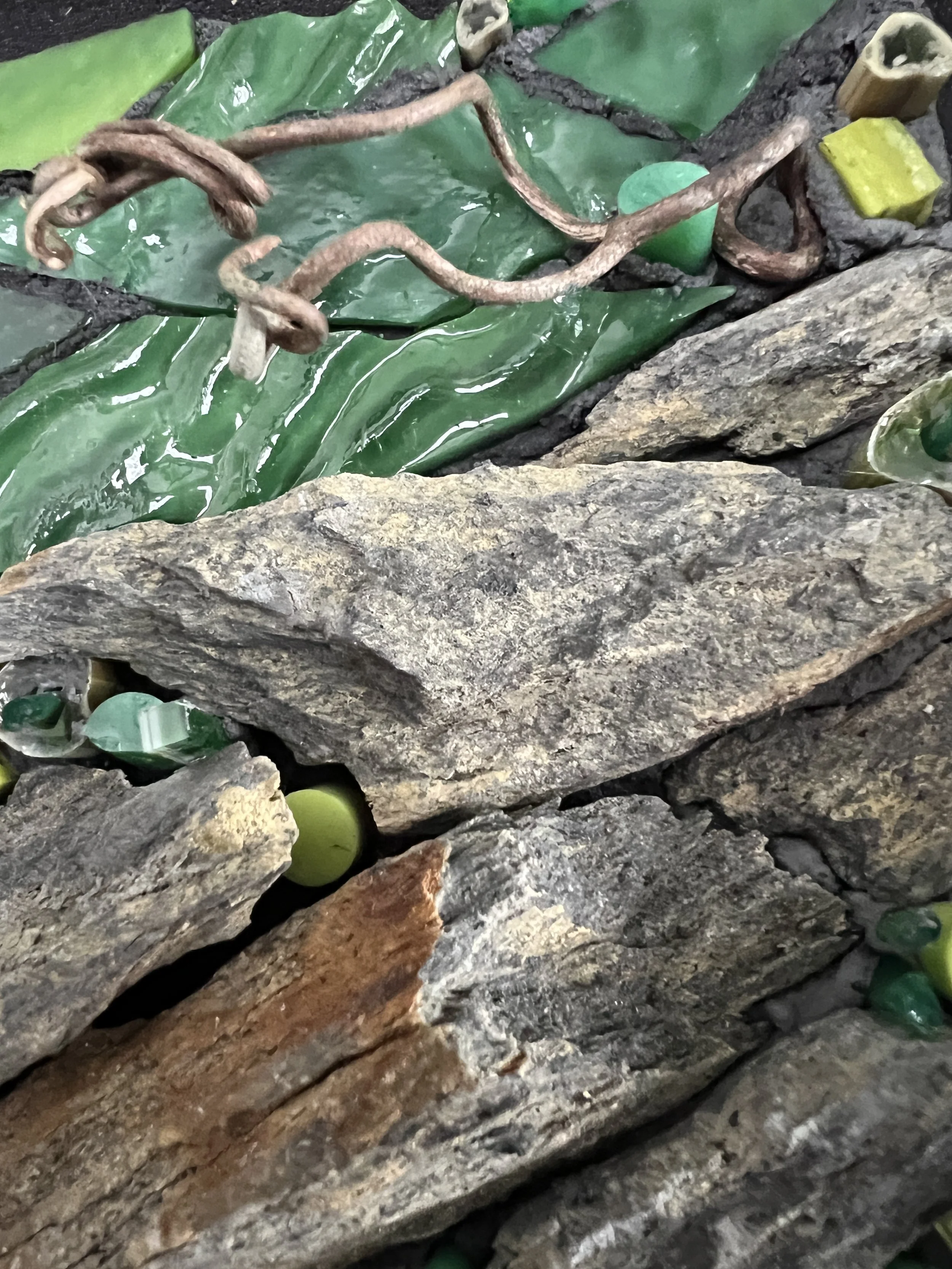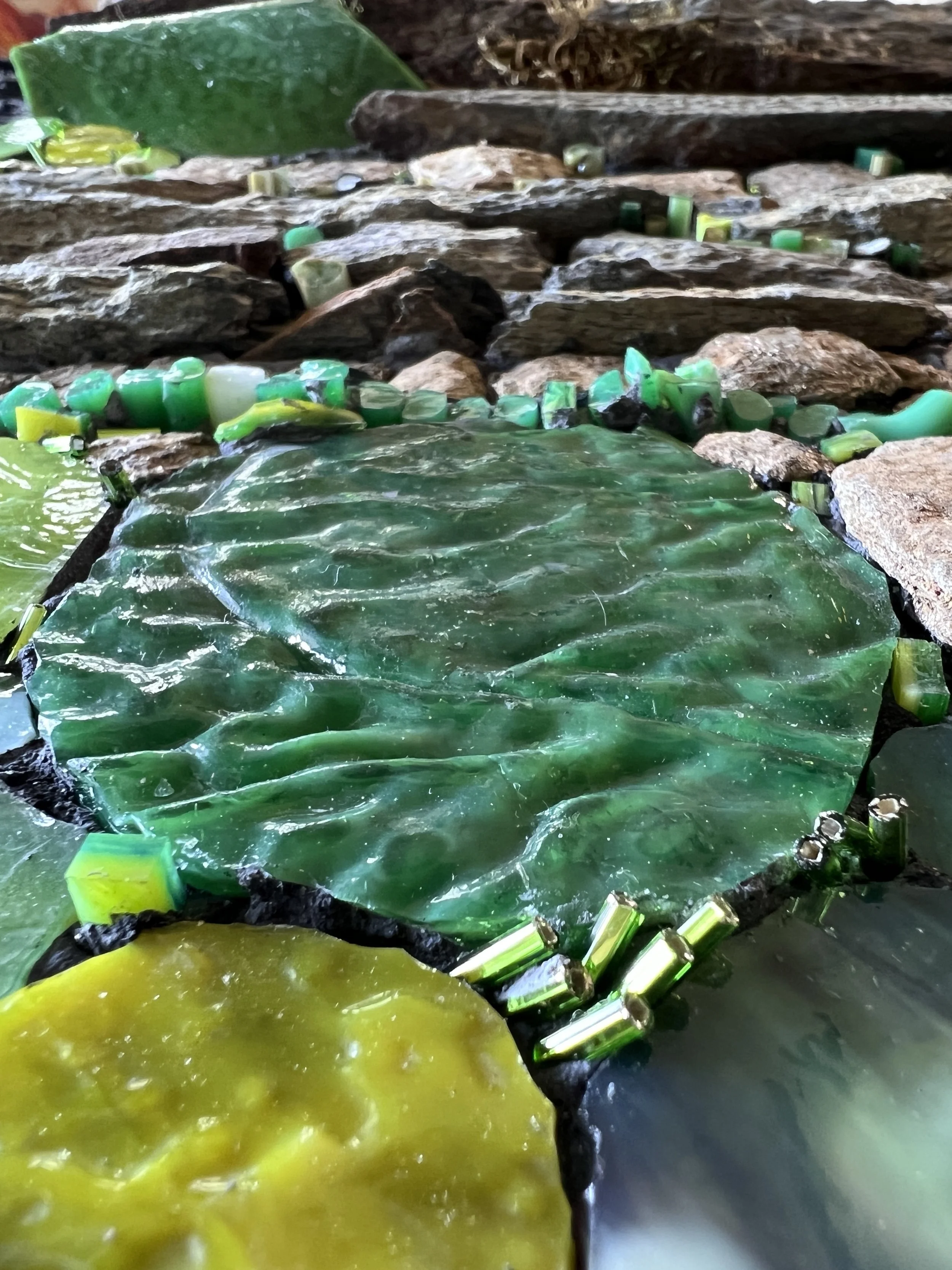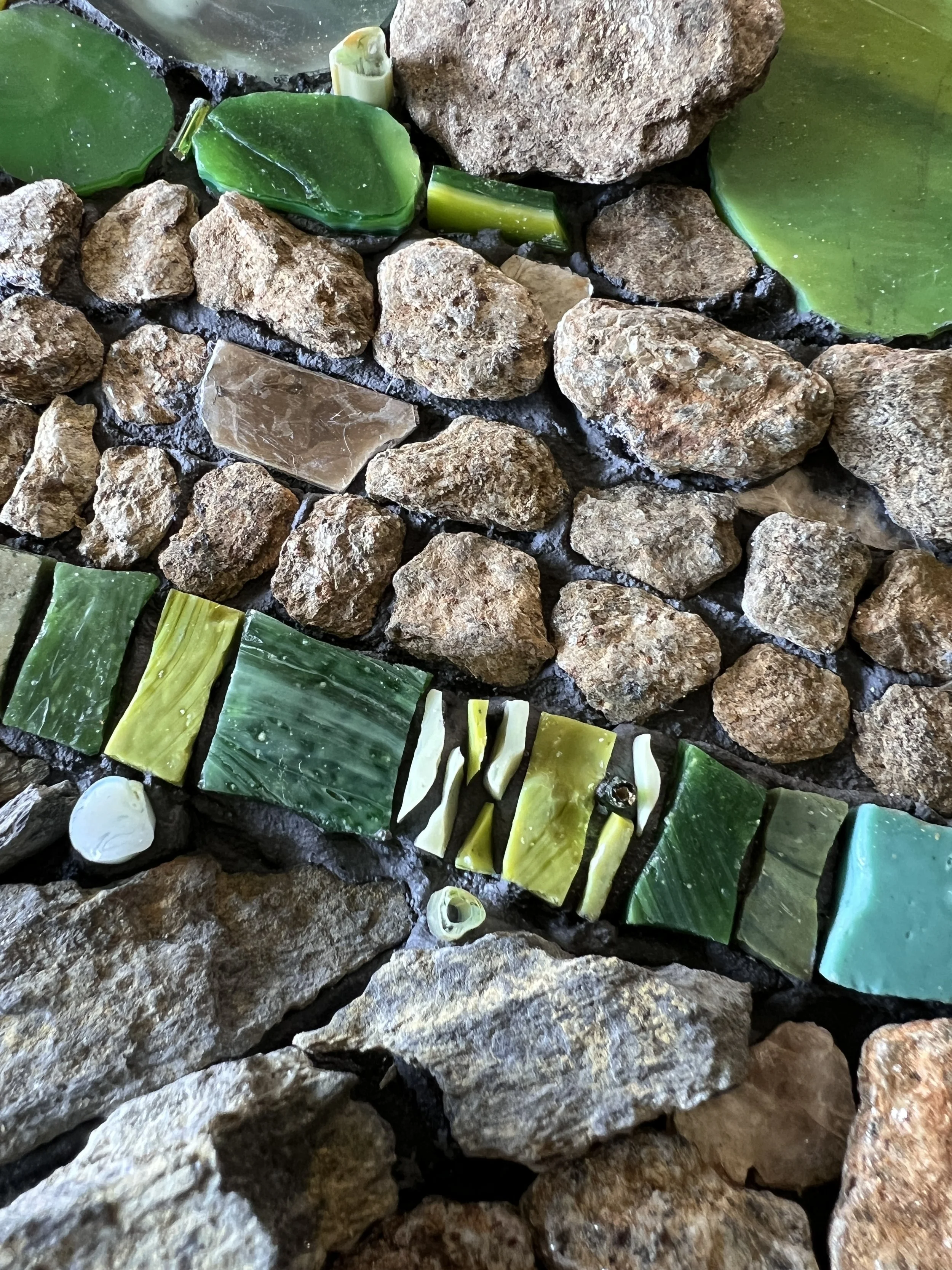 Materials: rocks foraged in Western North Carolina, stained glass, aluminum machine shop shavings, and LOVE. This piece is like a little city. How do we govern ourselves? And each other?