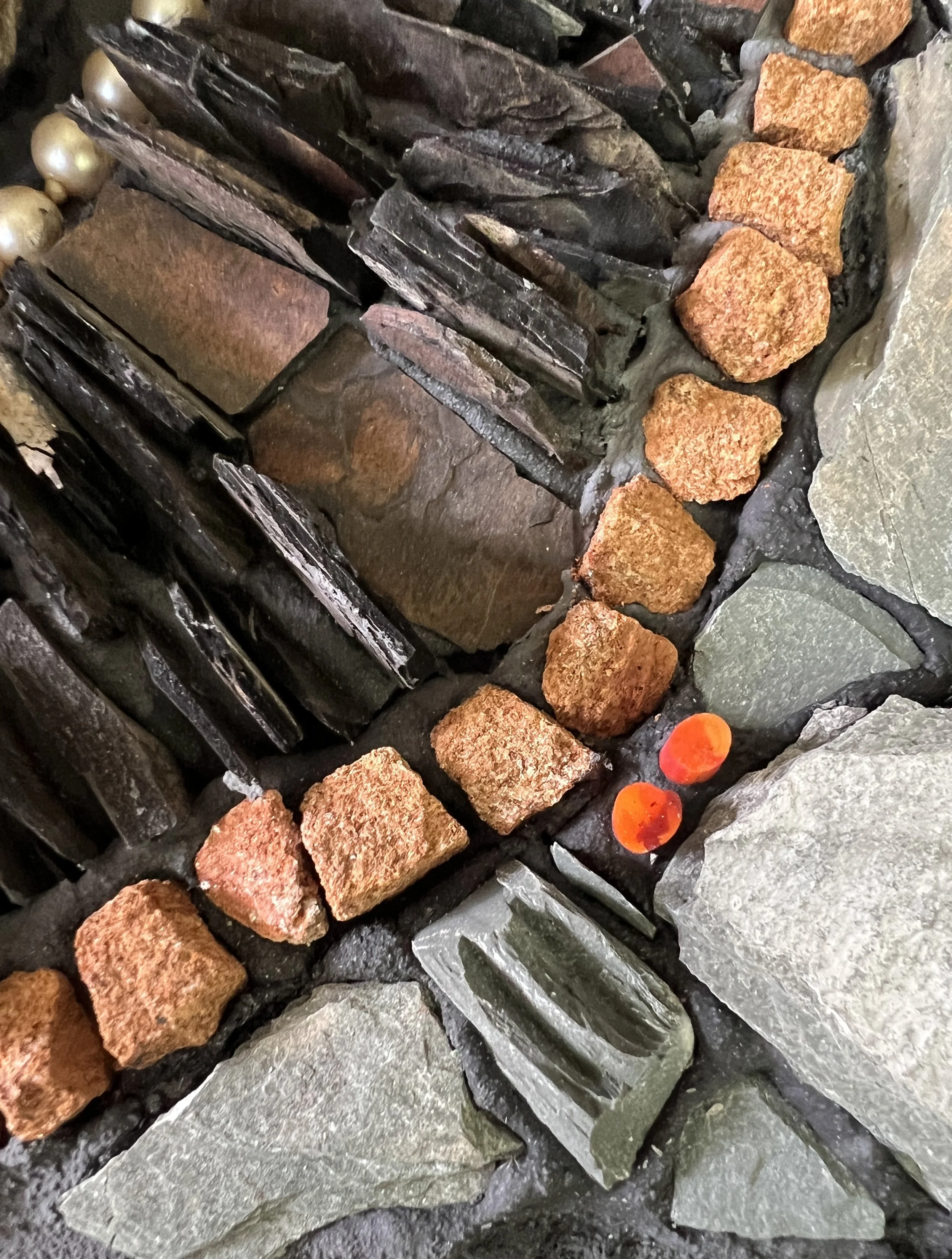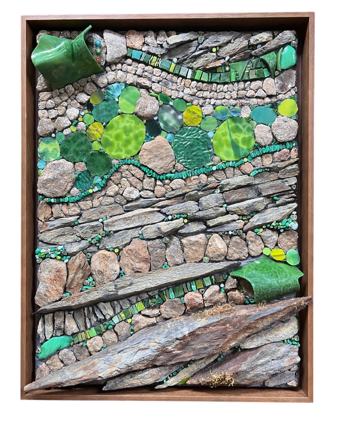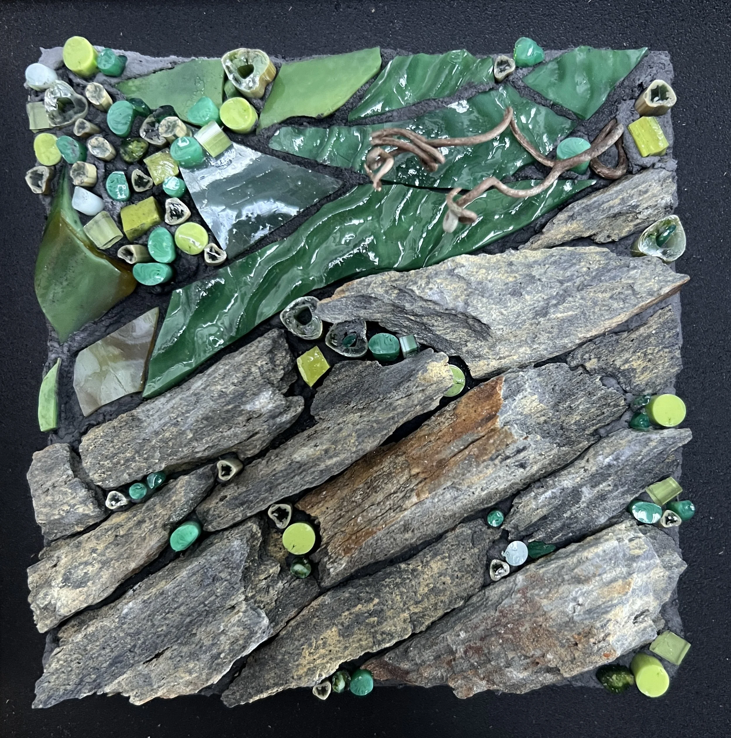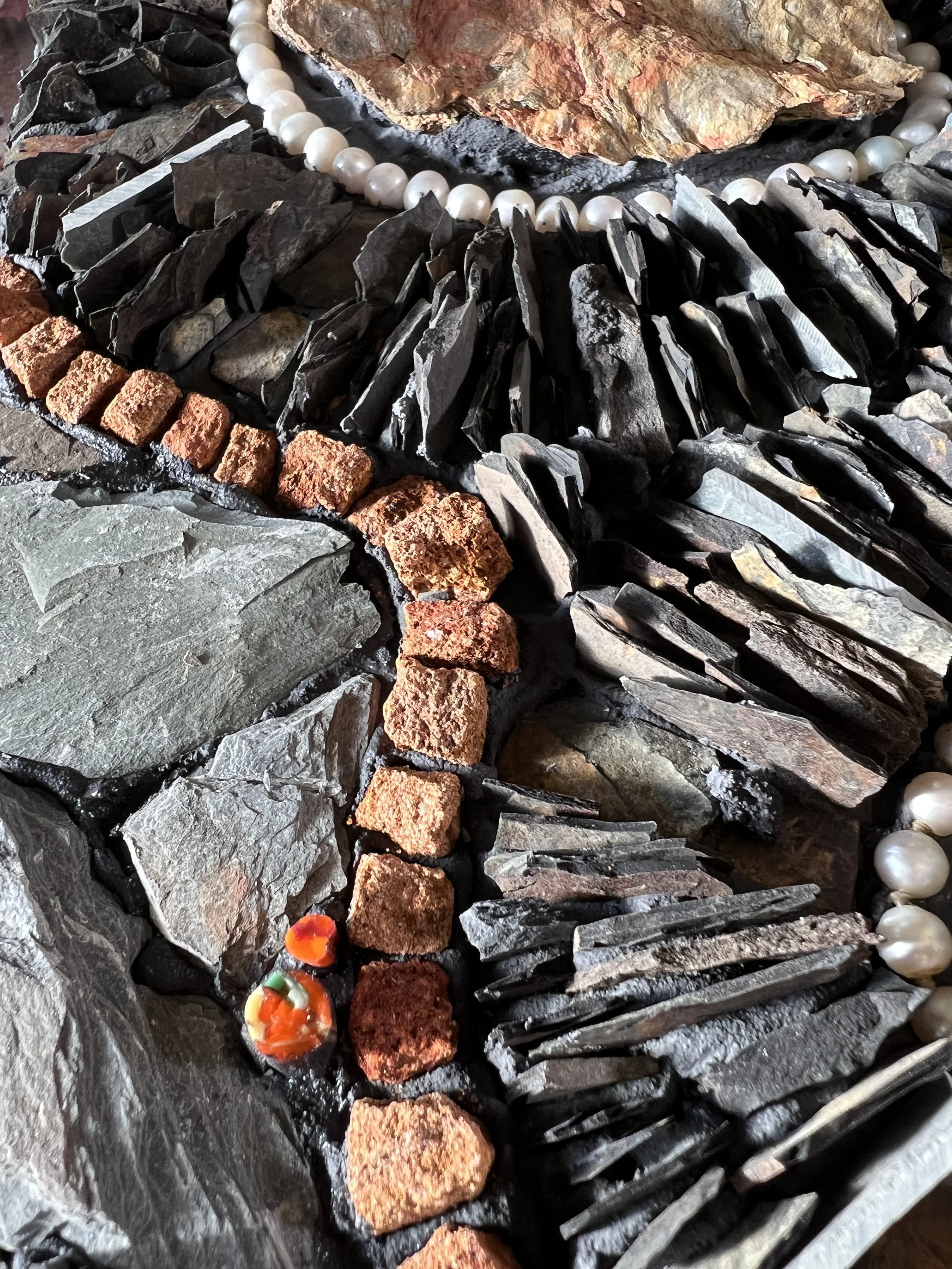 Materials: rocks foraged in Western North Carolina, stained glass, aluminum machine shop shavings, and LOVE. This piece is like a little city. How do we govern ourselves? And each other?