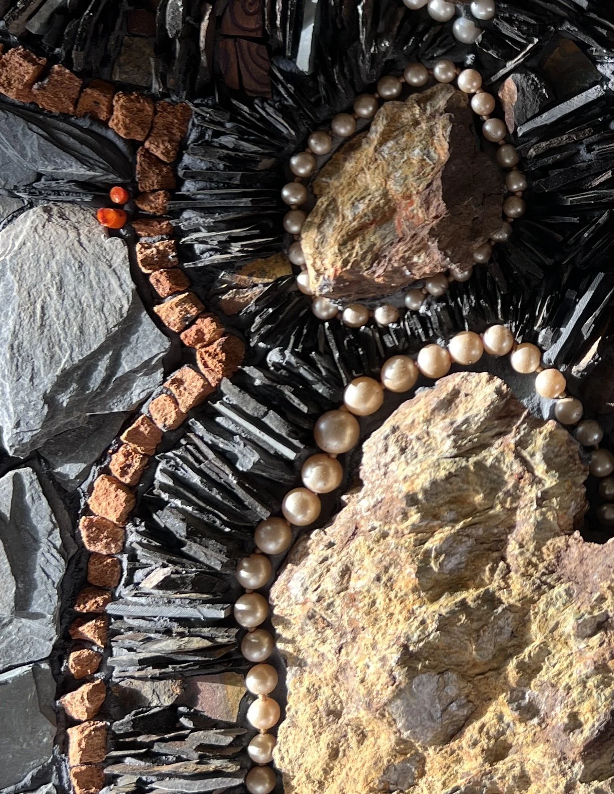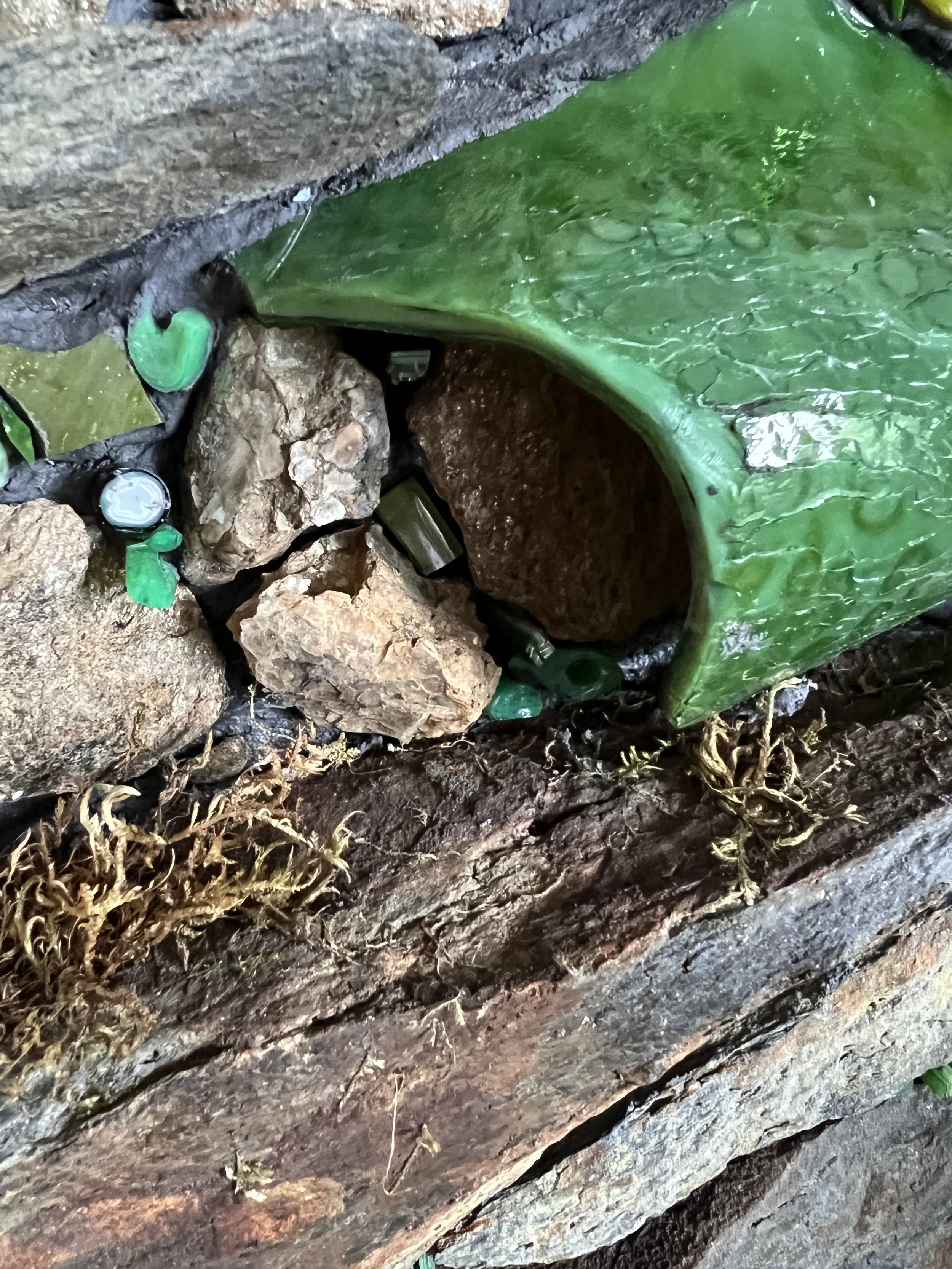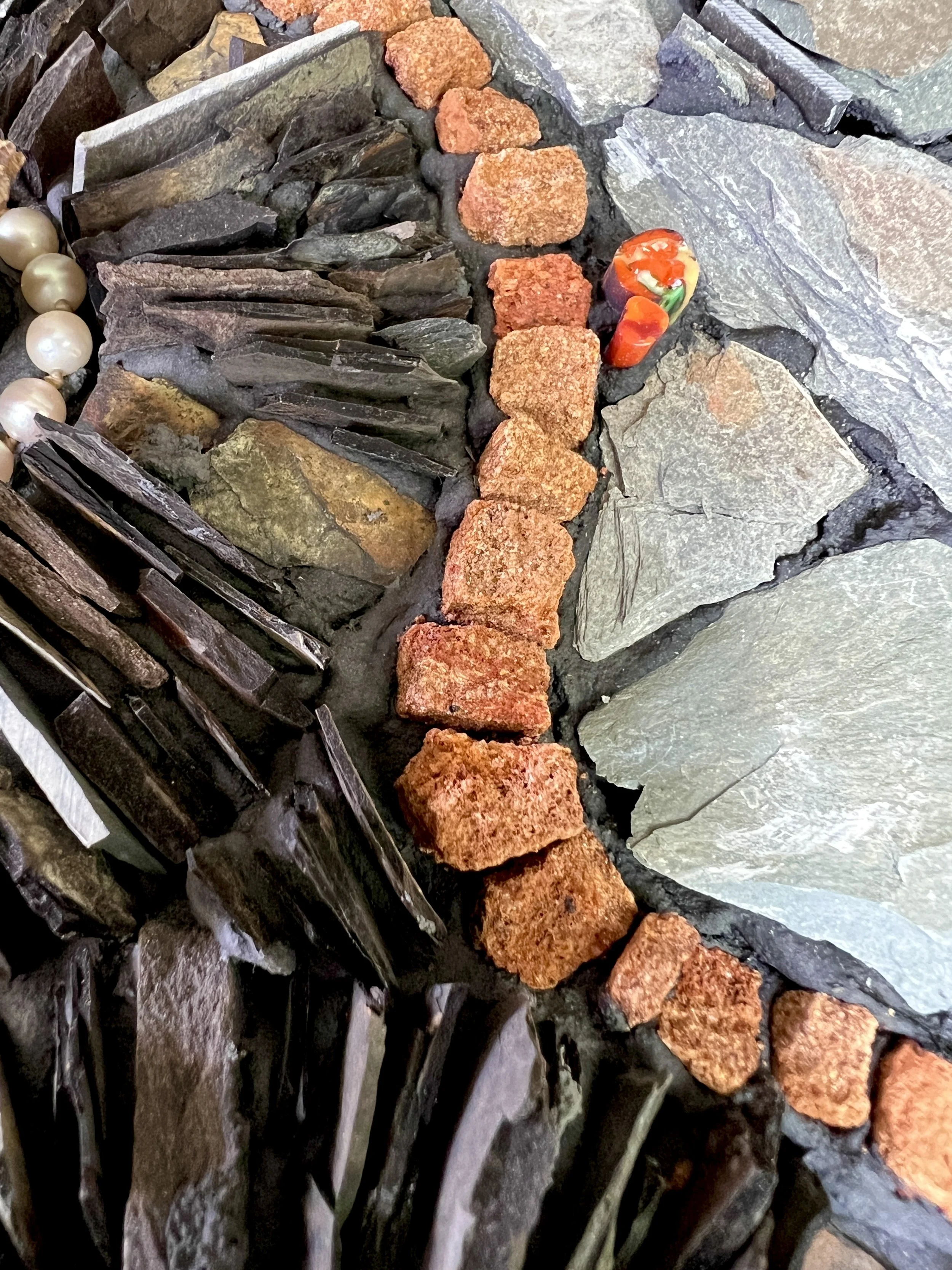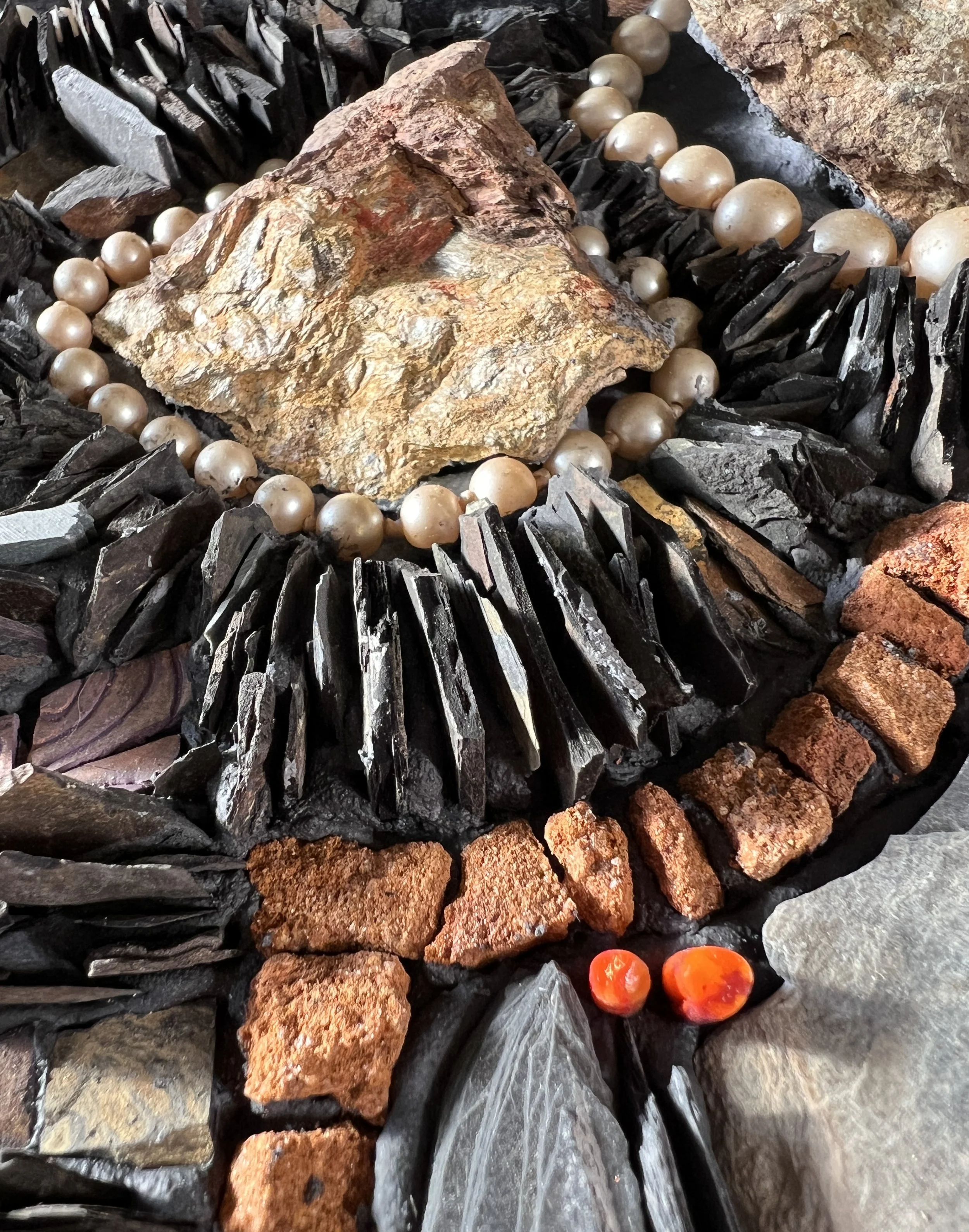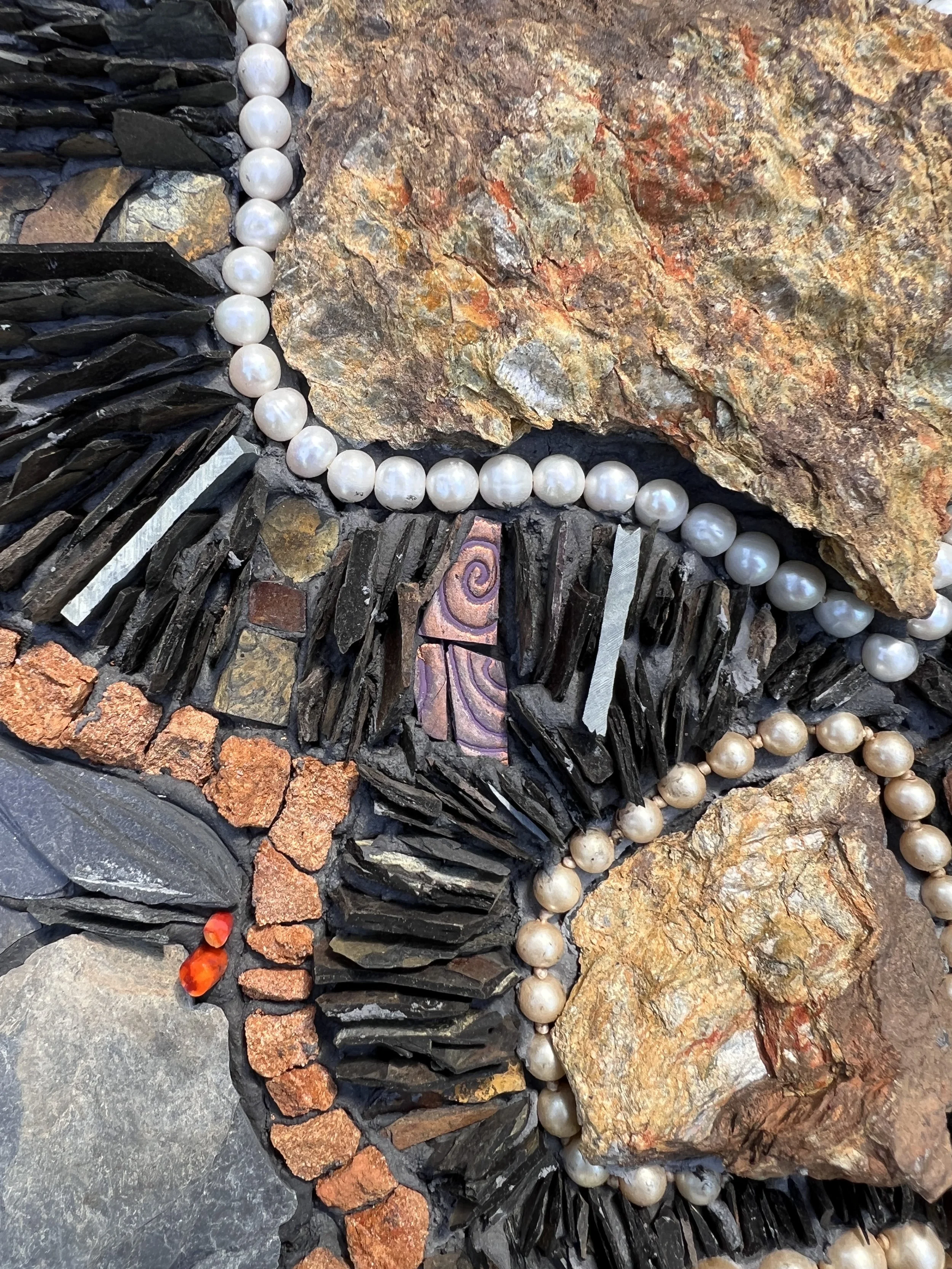 Materials: rocks foraged in Western North Carolina, stained glass, aluminum machine shop shavings, and LOVE. This piece is like a little city. How do we govern ourselves? And each other?