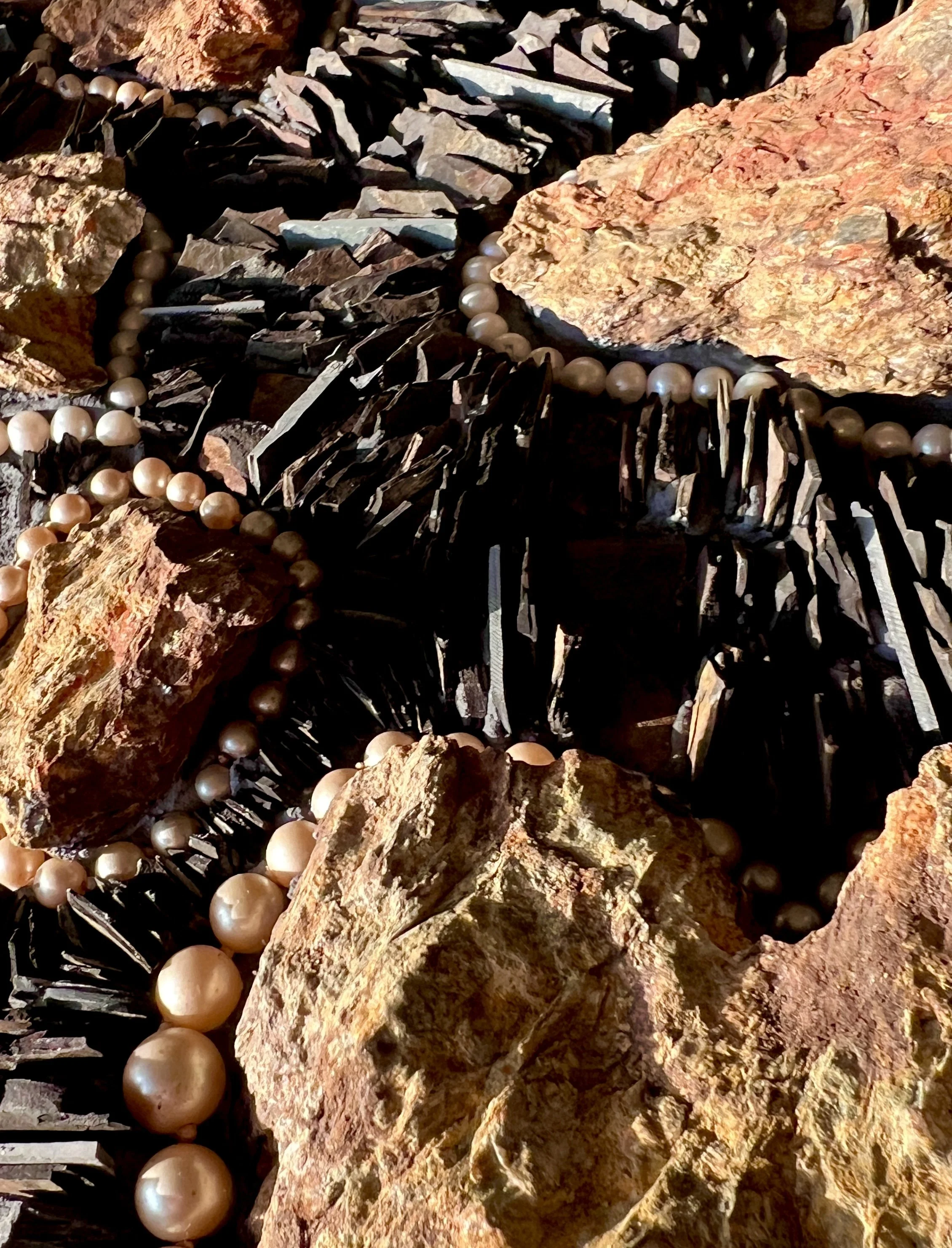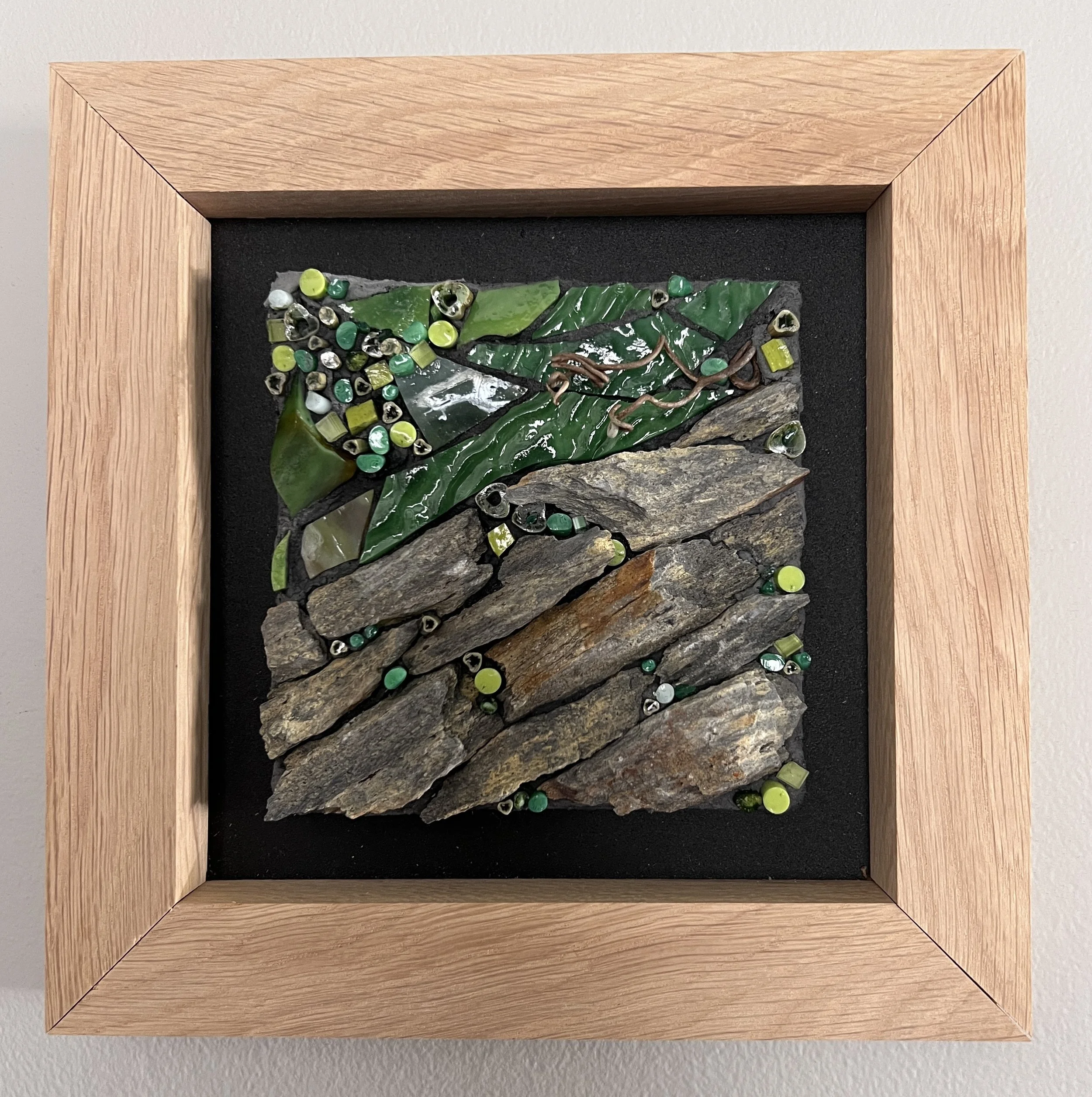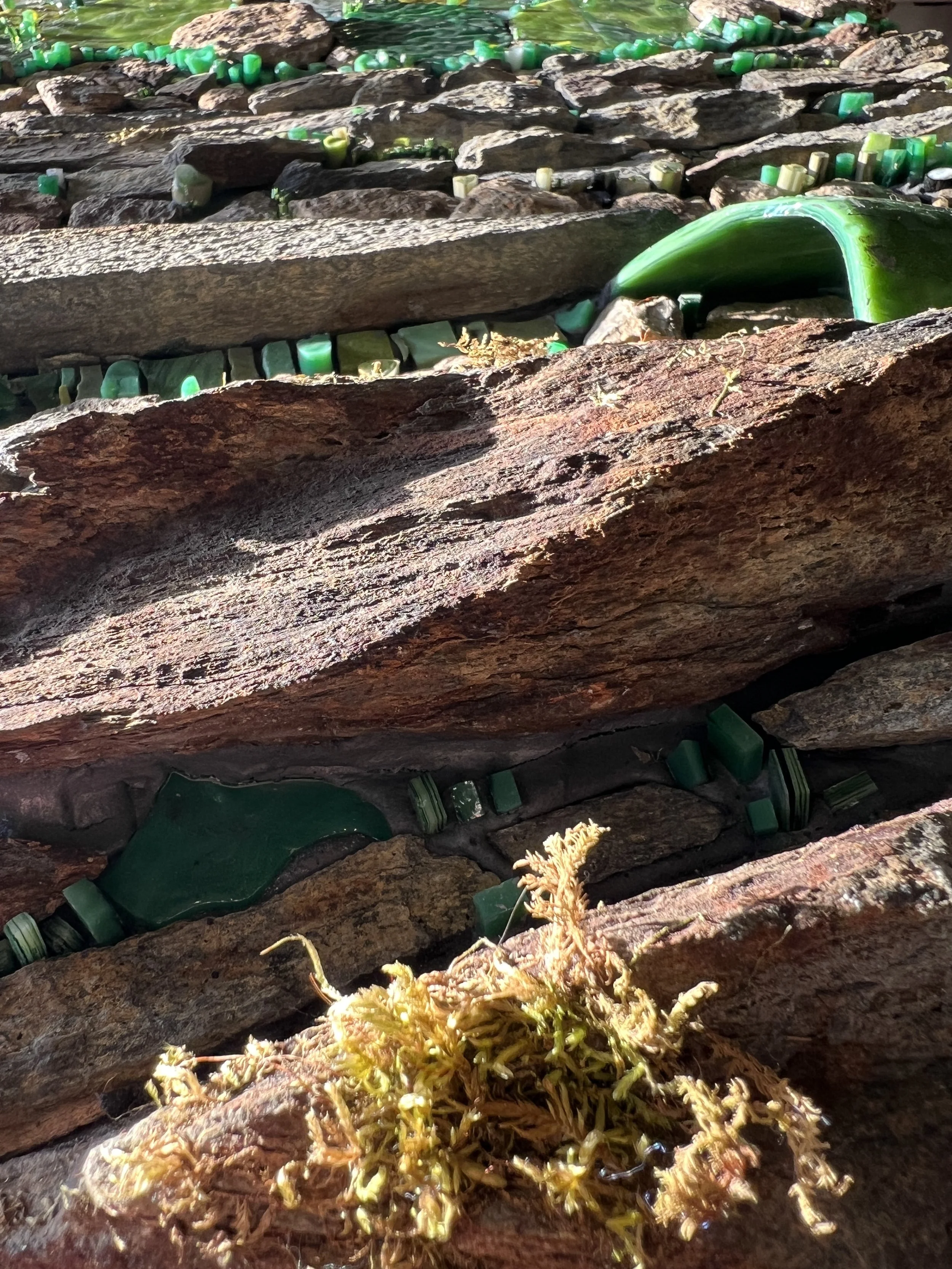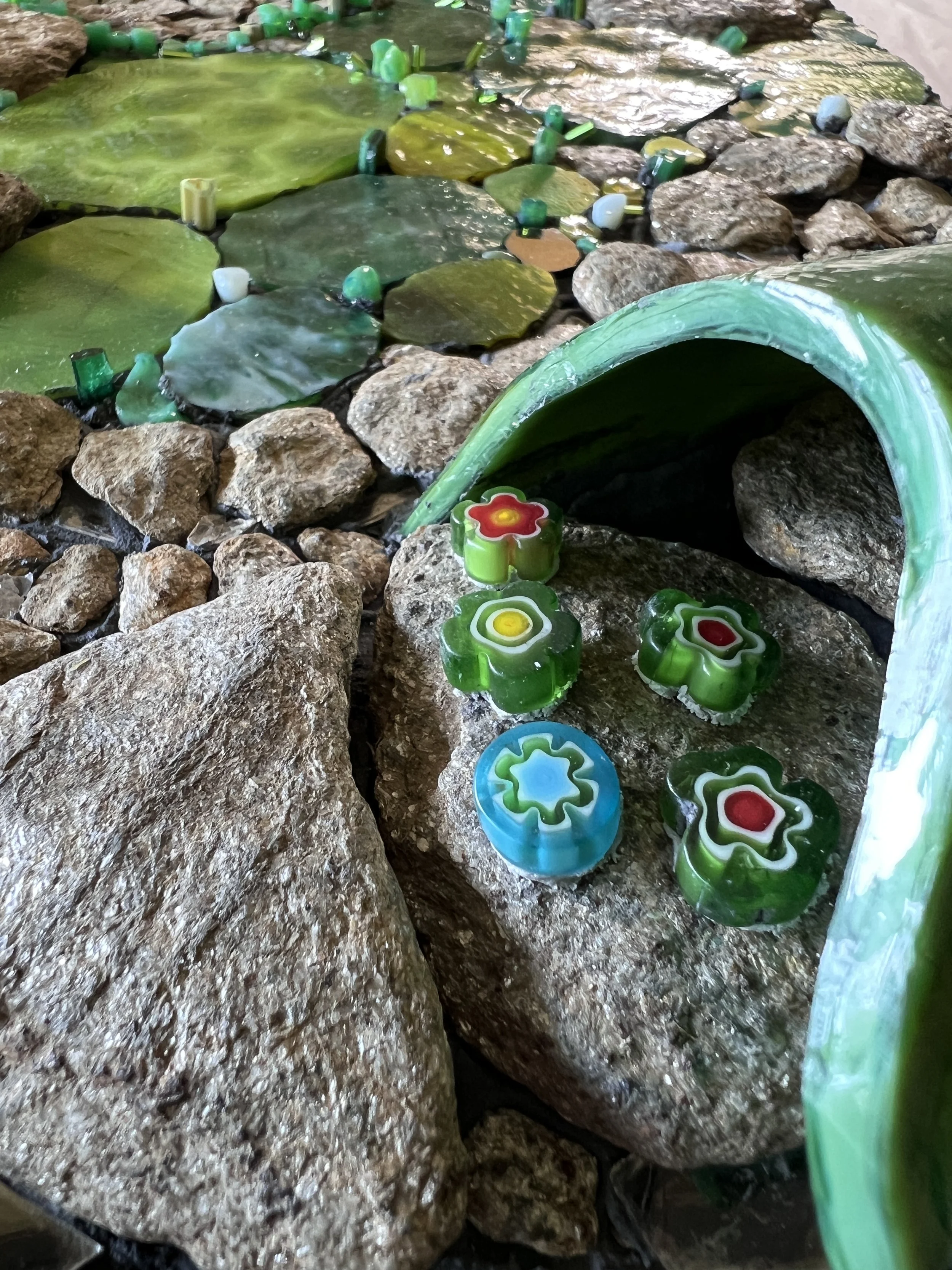 Materials: rocks foraged in Western North Carolina, stained glass, aluminum machine shop shavings, and LOVE. This piece is like a little city. How do we govern ourselves? And each other?