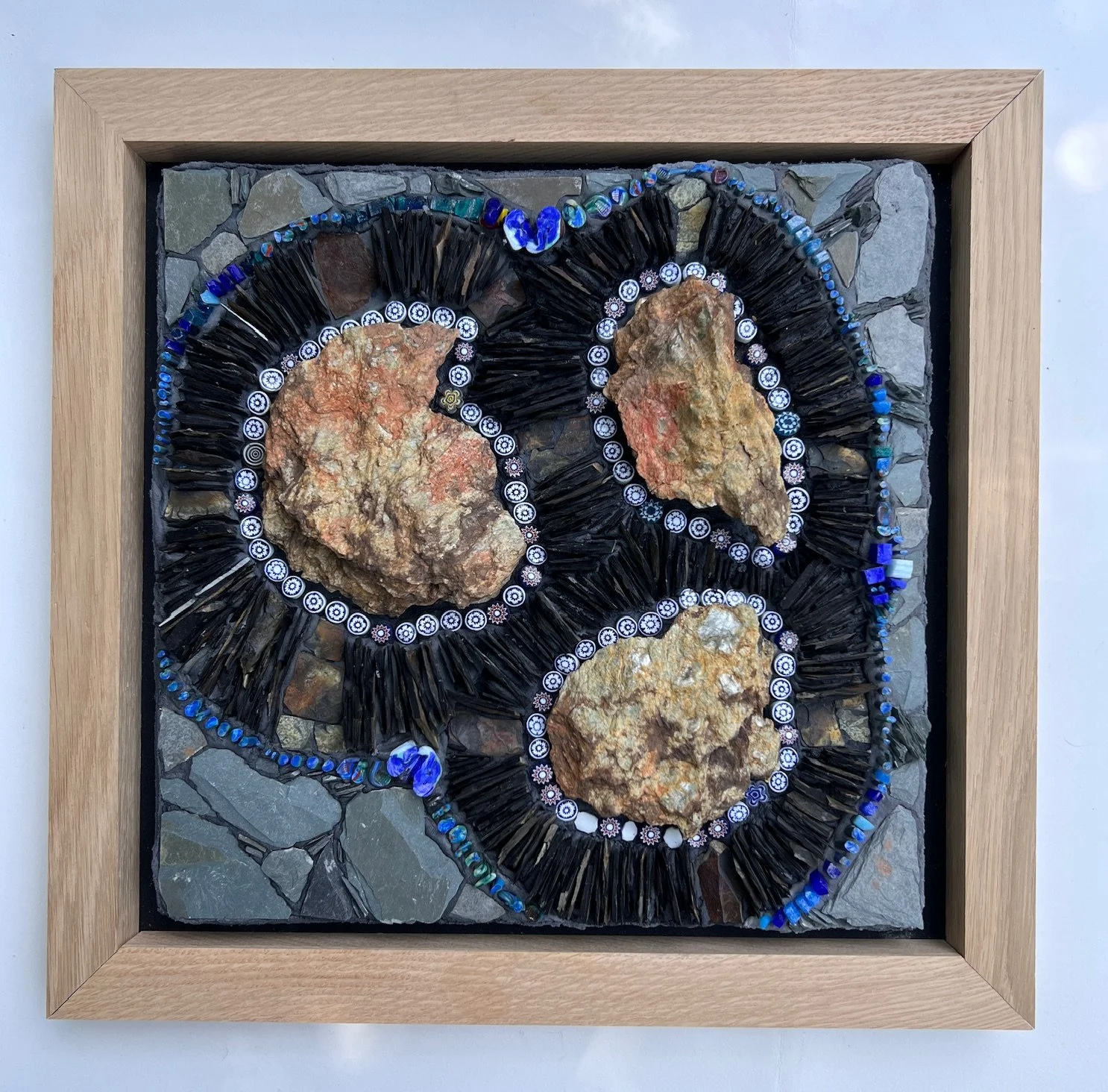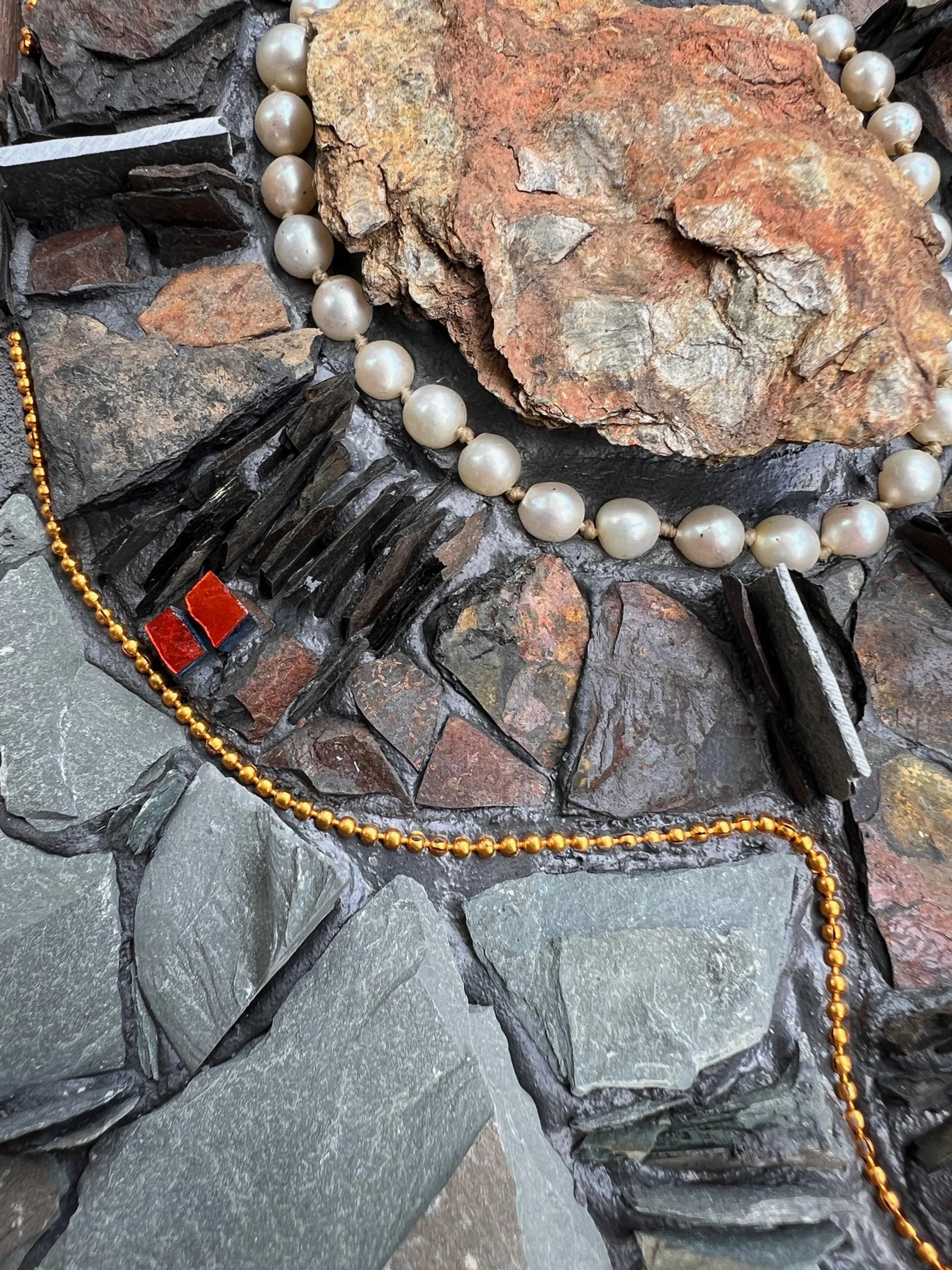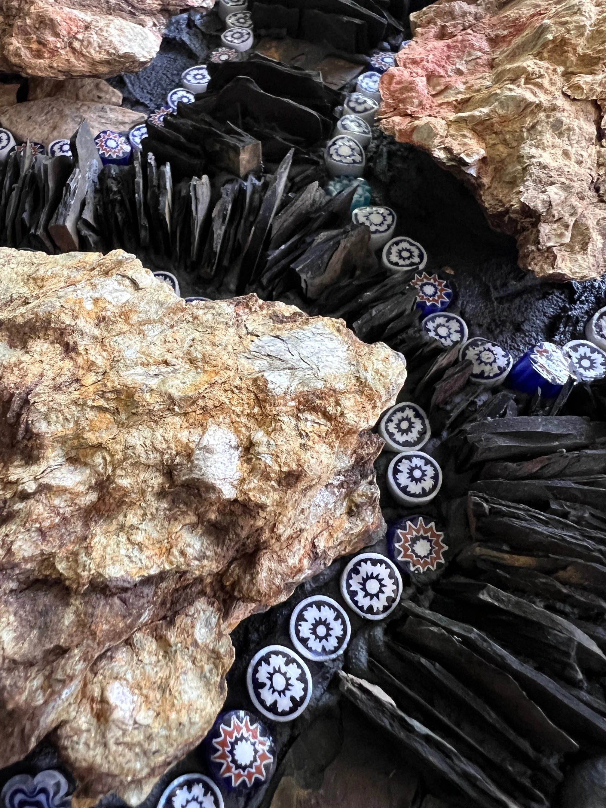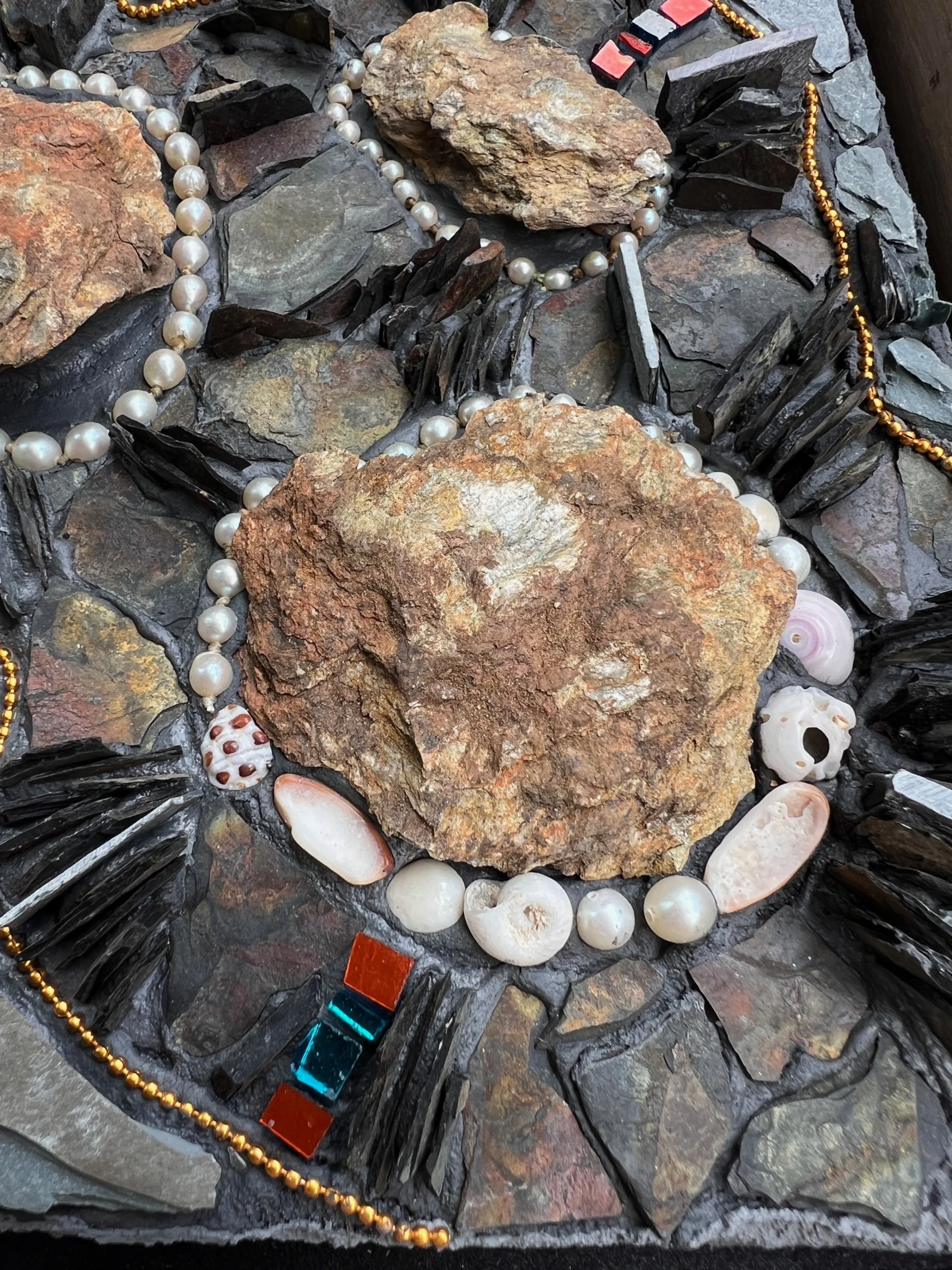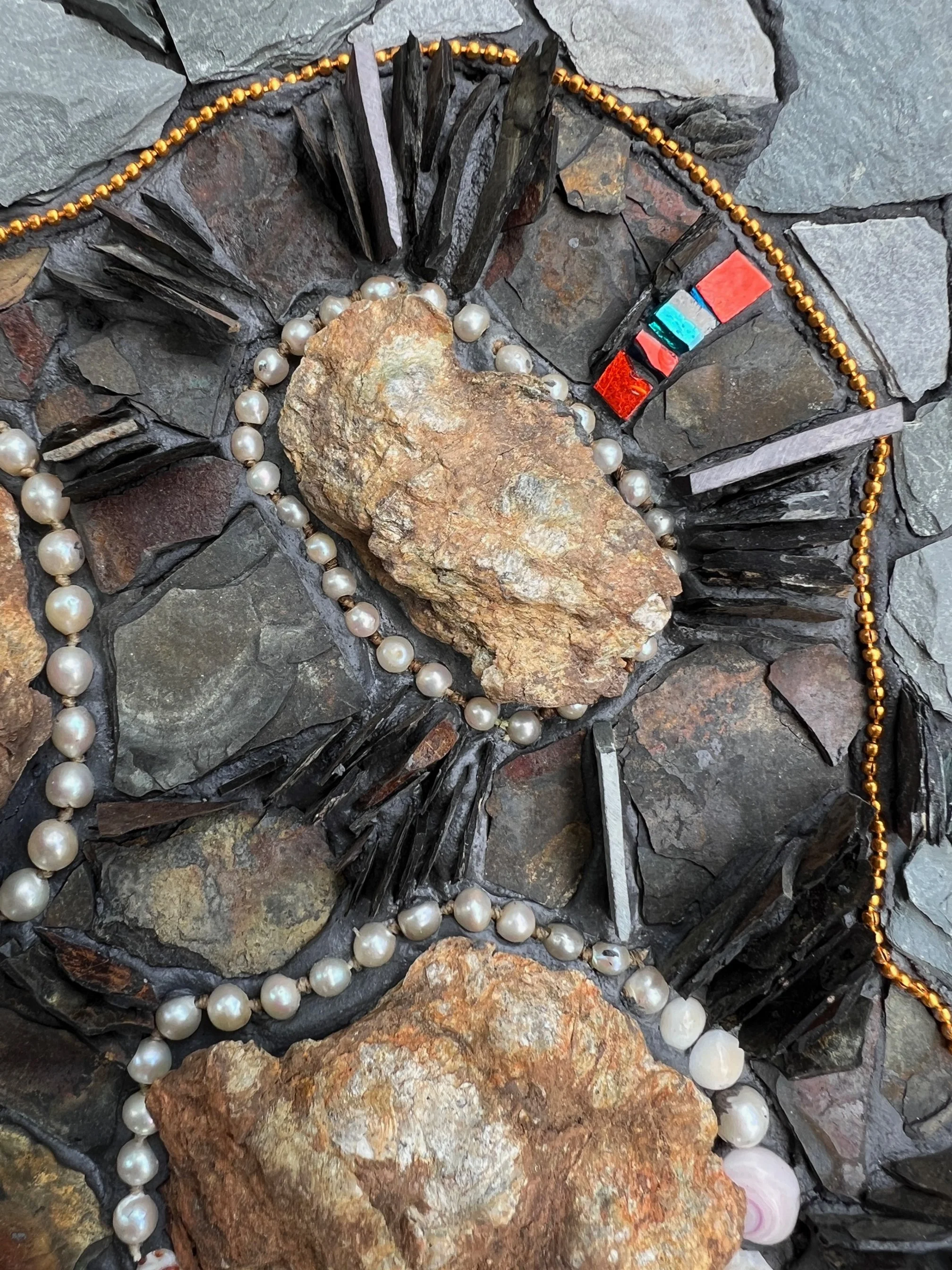 It’s made with rocks foraged in the mountains around Asheville, pearls given to me by my mother many years ago, shale, slate, filati (hand-pulled glass rods), and polymer clay.